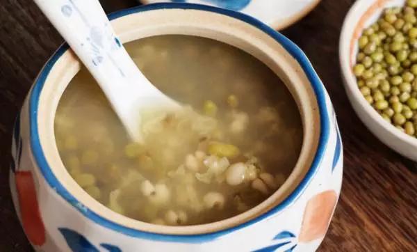 3、綠豆洗凈,浸水泡約一小時(shí)后,撈出倒入鍋中,加入10杯水,煮至綠豆裂開(kāi);