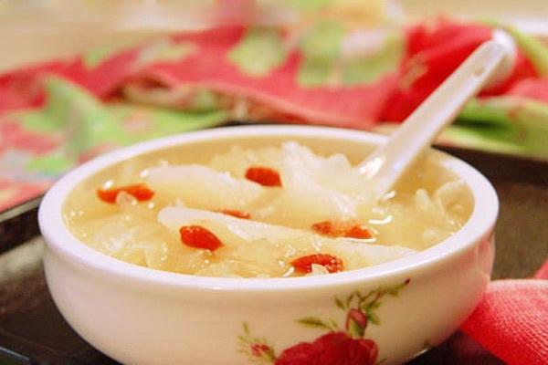 做法:將水發(fā)銀耳去根、去雜洗凈,撕成小片;將雪梨去皮、去籽,切成多塊。將銀耳片、雪梨塊、貝母、白糖同放在燉皿內上籠蒸30-40分鐘,取出,即可裝盤(pán)食。