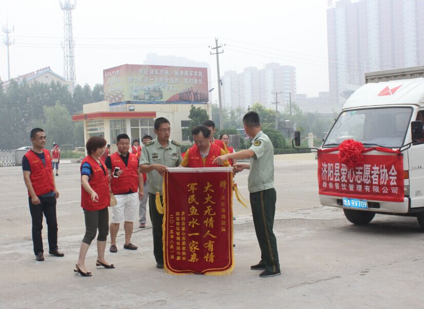 2015年八一建軍節來(lái)臨之際,濟南舜泰餐飲管理有限公司攜手濟陽(yáng)縣愛(ài)心志愿者協(xié)會(huì )為濟陽(yáng)消防大隊官兵送去錦旗和愛(ài)心物資。